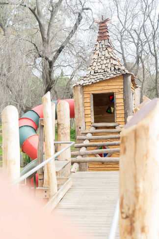 This playground is a mix of traditional play ground spaces and nature play elements incorporating and inspired by local history.